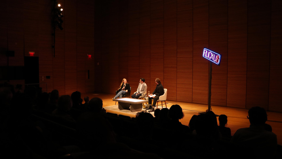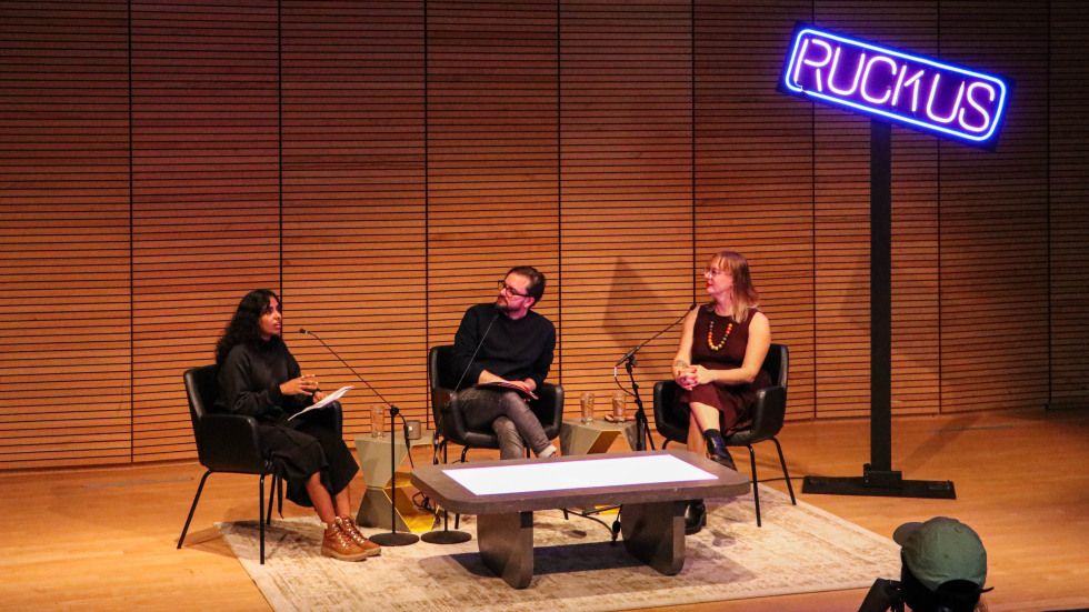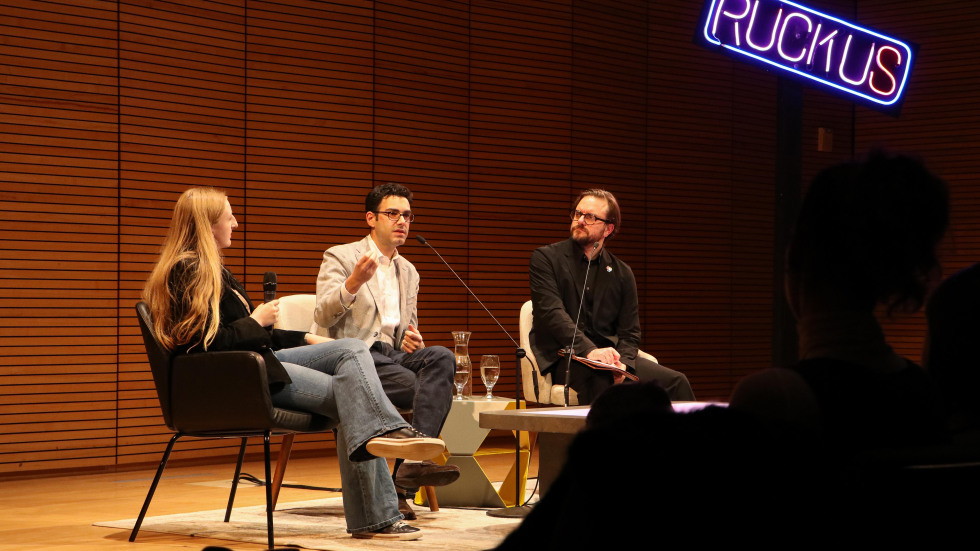 From left to right: Student interlocutor Rishika Kartik, BAI Director Sydney Skybetter, and Dr. Costanza-Chock in conversation on stage at the first Ruckus Session.